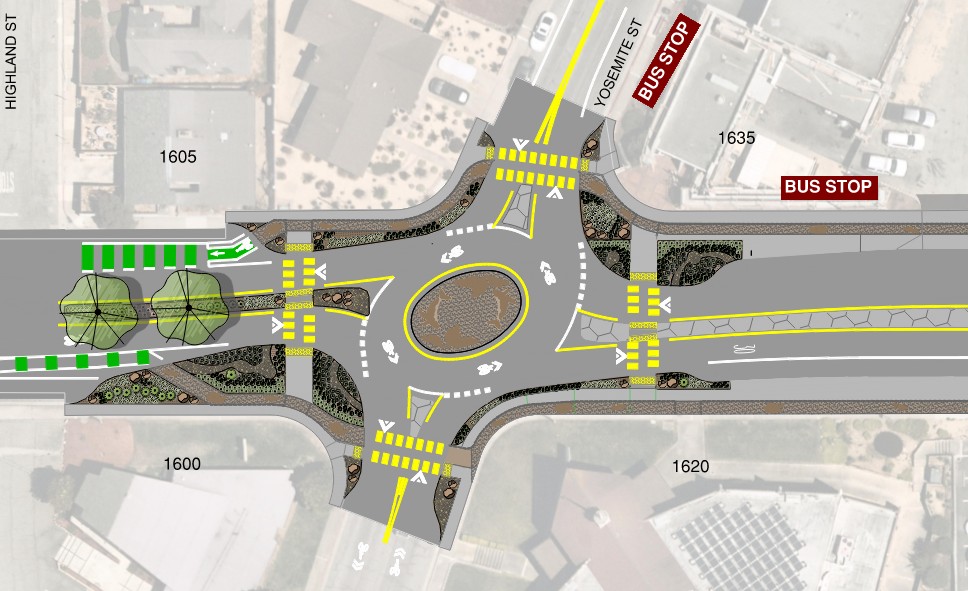 It became clear that the Broadway and Yosemite intersection would need to work better if Broadway was reduced from four lanes to two. Because of this, the City recommended studying a roundabout at Yosemite Street to slow traffic and improve safety for people walking and biking.
