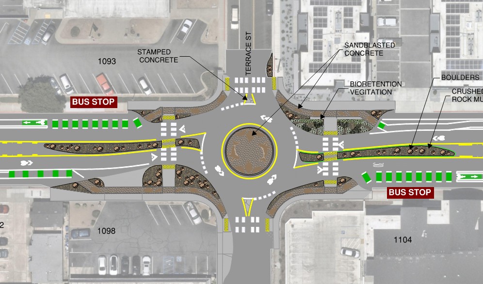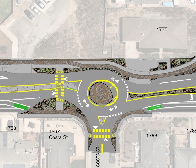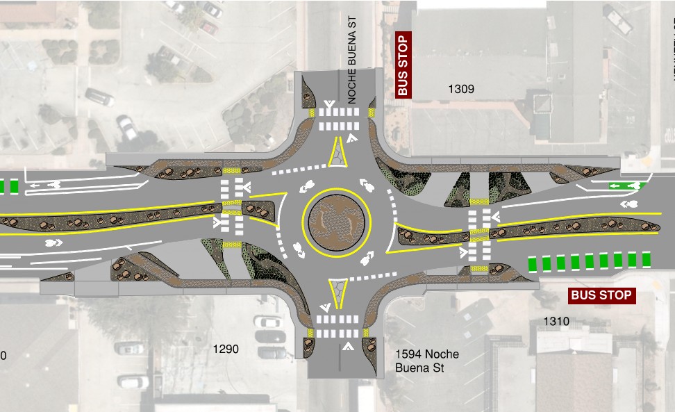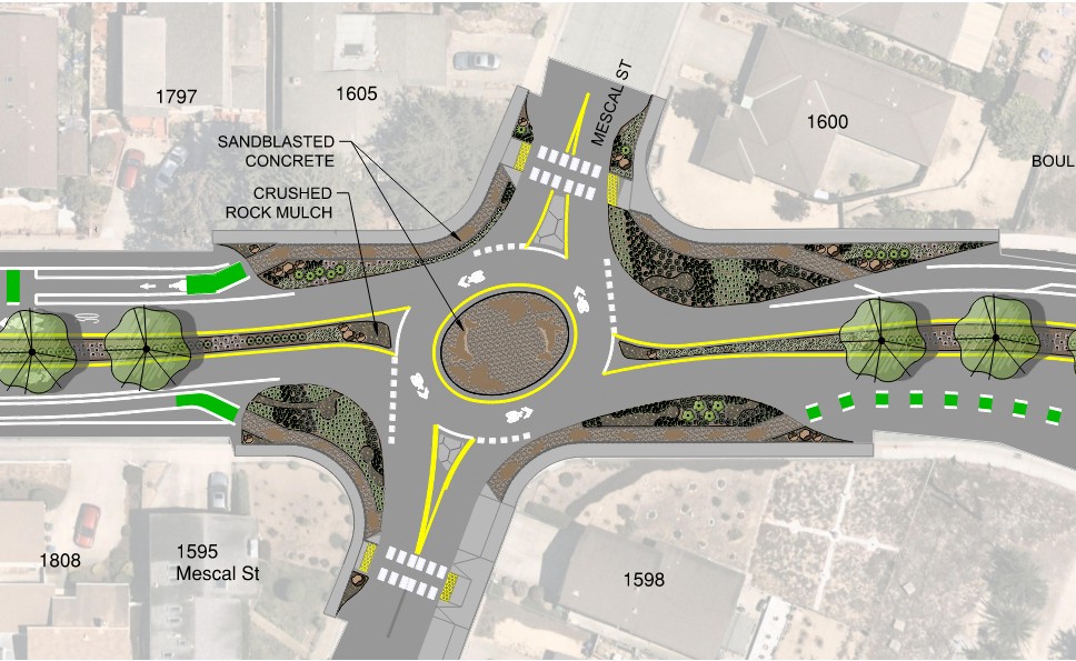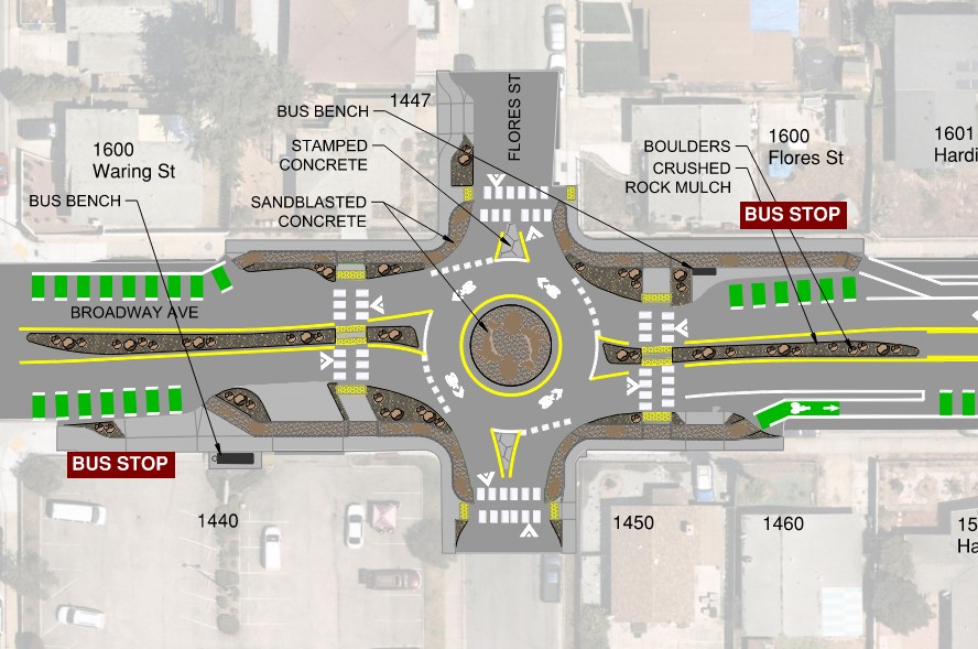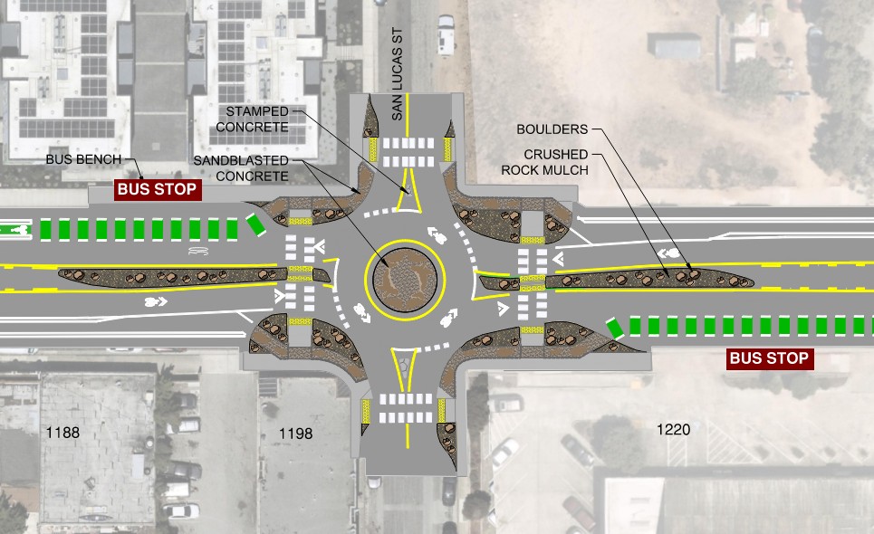 After more study, it was found that adding roundabouts at Terrace, Yosemite, Noche Buena, San Lucas, Flores, Costa, and Mescal would make it possible to reduce lanes on Broadway. This lane reduction, called a “road diet,” would improve safety while still allowing traffic to move through the corridor.